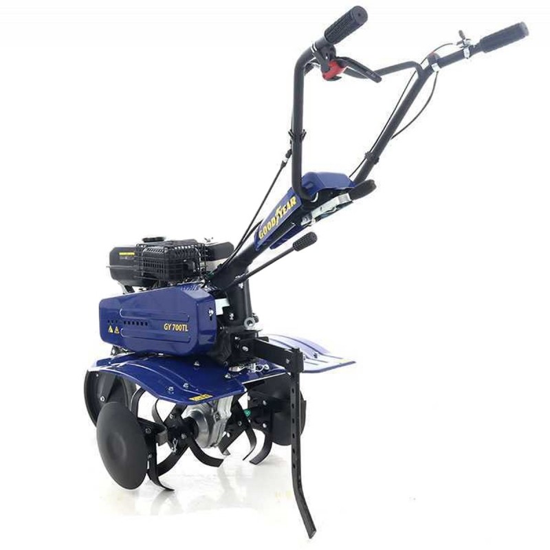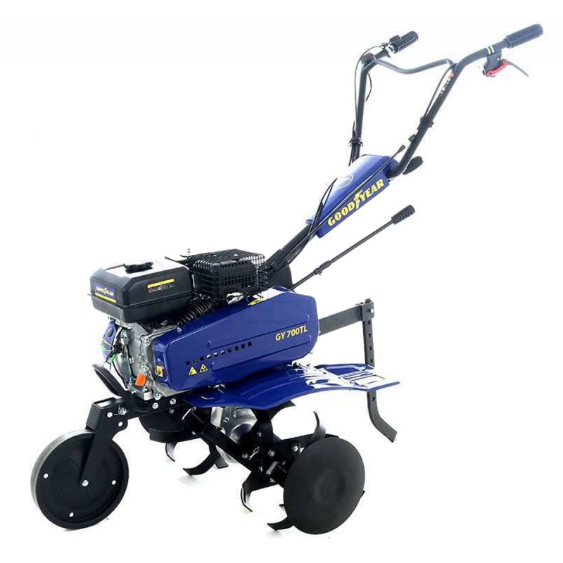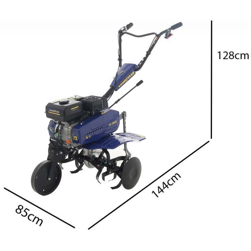 Motoazada Goodyear de 7hp indicada para terrenos medios, ara la tierra de una manera fácil con esta motoazada, tiene una transmisión bañada en aceite, esto hace que sea de calidad alta con un precio económico, filtro de aire triple con baño de aceite, con un ancho de trabajo de 500-600-800mm y una profundidad de 150-300mm te permite introducir bien el apero en la tierra y trabajar con potencia sin fatiga. Sus 212cc le hace una máquina potente para las labores de la tierra y pudiendo añadirle los distintos aperos podrás realizar muchas funciones: arranaca patatas, arado japones, rastrillo entre otros. Cuenta con 2 velocidades delanteras y una trasera, y una capacidad de combustible de 6L que hará que puedas trabajar sin repostar durante horas. Incluye cuchillas de 6 fresas. VENTAJAS: Manillar ajustable en altura y lateralmente. Sistema triple de filtro de aire en baño de aceite. Grifo de purga en carburador. Embrague de doble correa. Ruedas agrícolas 400×8 incluidas. Rueda transporte frontal. Platos protectores.